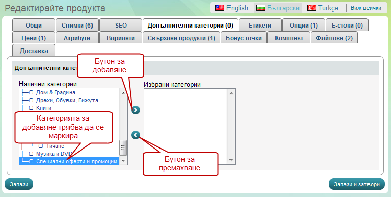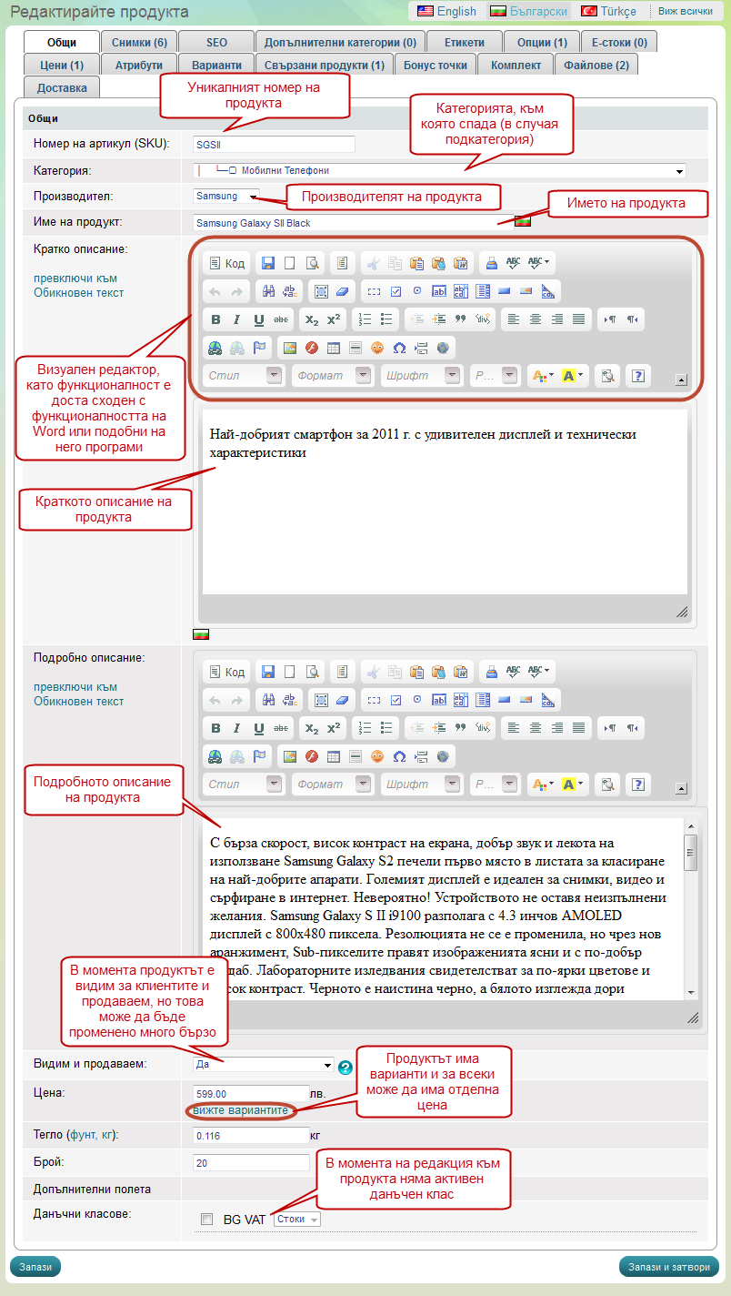 Като цяло няма нищо различно от прозореца, при който създаваме продукт. В случая просто е включен визуалният редактор с помоща, на който лесно може да стилизирате текста в описанията.