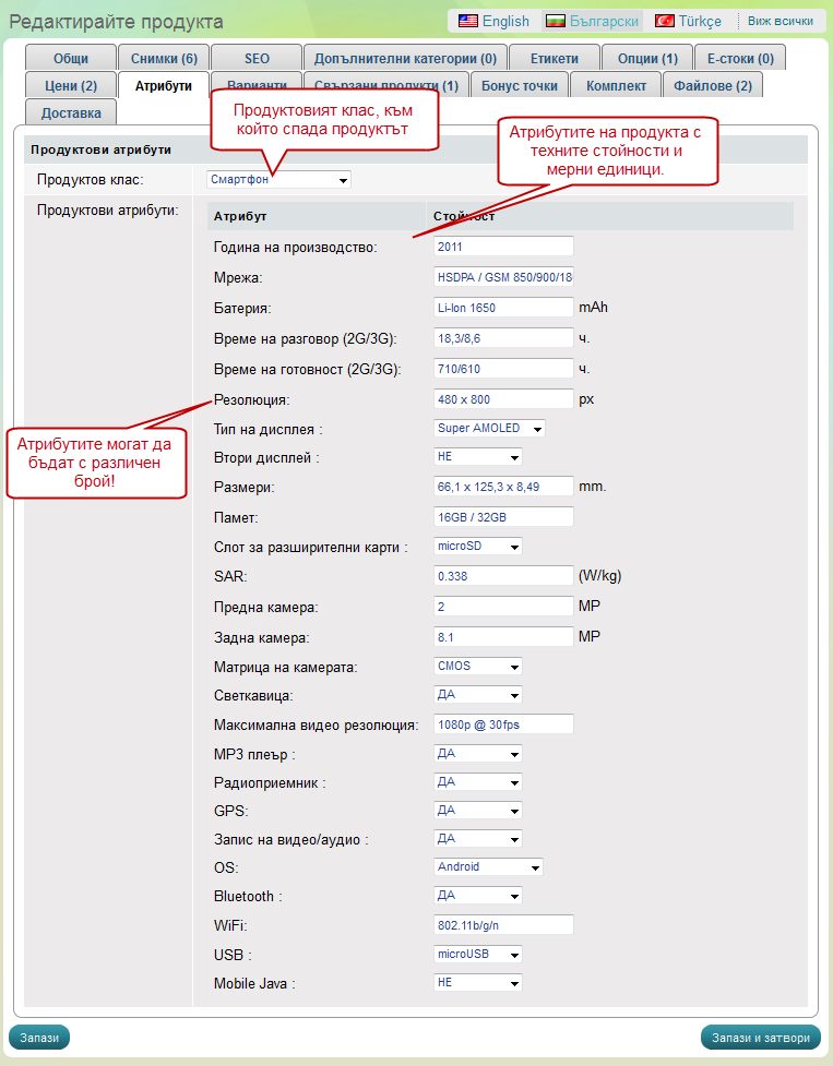 Атрибутите се свързват в продуктови класове, като с помоща им може да дадете повече информация за продукта на клиента. Атрибутите и Продуктовите класове са разрешени само в пакет „Pro“. В случаят продукта спада към продуктов клас „смартфон“, който от своя страна съдържа купища атрибути.