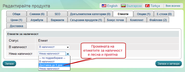 От този раздел може да сложите конкретни етикети за наличност на всеки отделен продукт вместо да използвате тези по подразбиране.