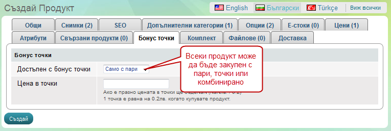 Ако бонус точките са Ви разрешени, то може да определяте кои продукти могат да бъдат закупени с тях или комбинирано с пари.