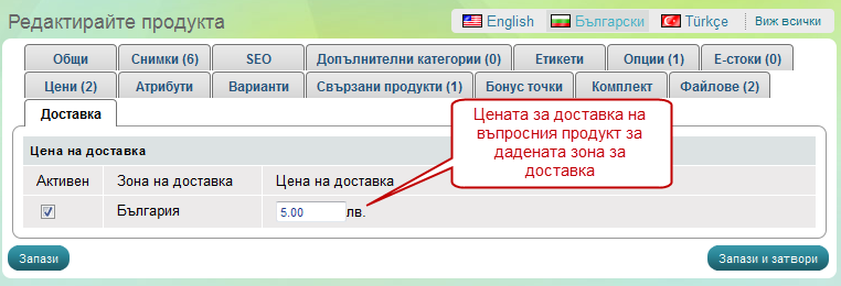 След това за всяка една зона за доставка, с която разполагате може, да зададете твърда цена за доставка.