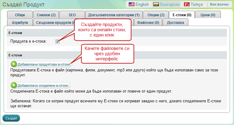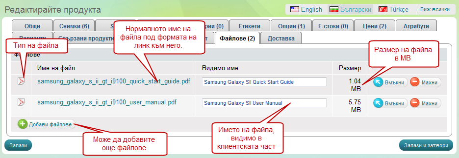 Към всеки продукт може, да добавяте файлове с цел допълнителна информация за продукта. Също може да добавяте файлове, в които клиента да открие как точно да работи с продукта или на какъв принцип работи продукта. Може да качвате всякакъв тип файлове освен файлове, които могат да изпълняват различни команди на сървъра, което се прави с цел по-висока сигурност на системата.