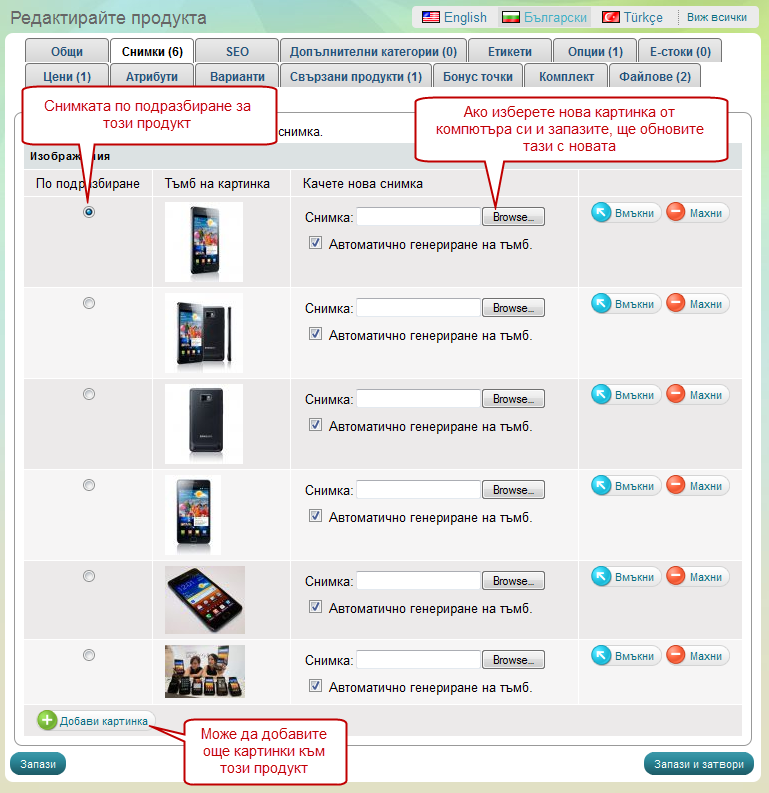 За всеки един продукт може да добавите неограничен брой картинки по приятен за Вас начин, а те автоматично ще се оразмерят с размерите зададени от Вас в настройките на магазина.