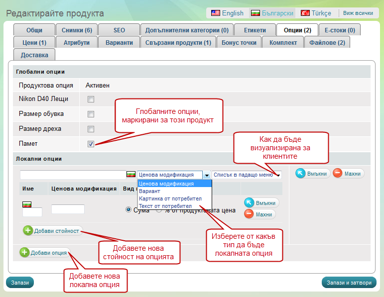 В случая към продукта има добавена глобална опция, но Вие може лесно да добавите нова такава. Също така може и да създадете локална опция, която ще се използва само в този продукт.