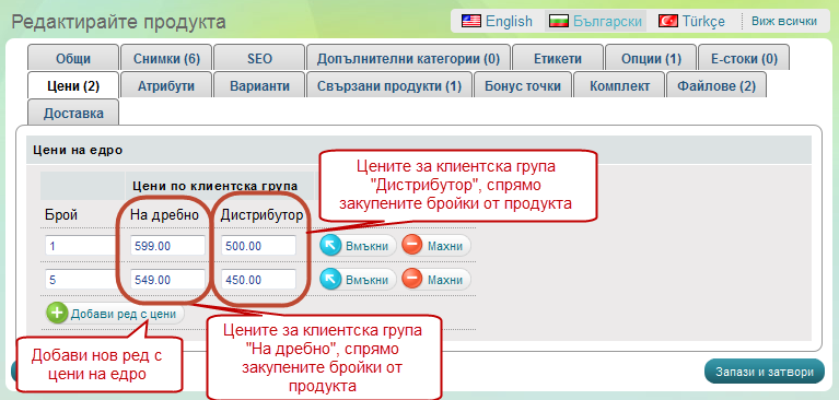 В раздел „цени“ може да редактирате цените за всяка една клиентска група, да добавяте нови цени за определен брой закупени продукти и т.н.