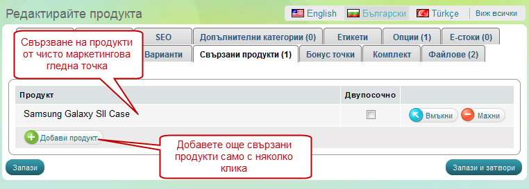 В този раздел може да добавяте всякакви продукти с чисто маркетингова цел, а също така и да улесните клиентите си, като им предлагате подхождащи си продукти или заместители.