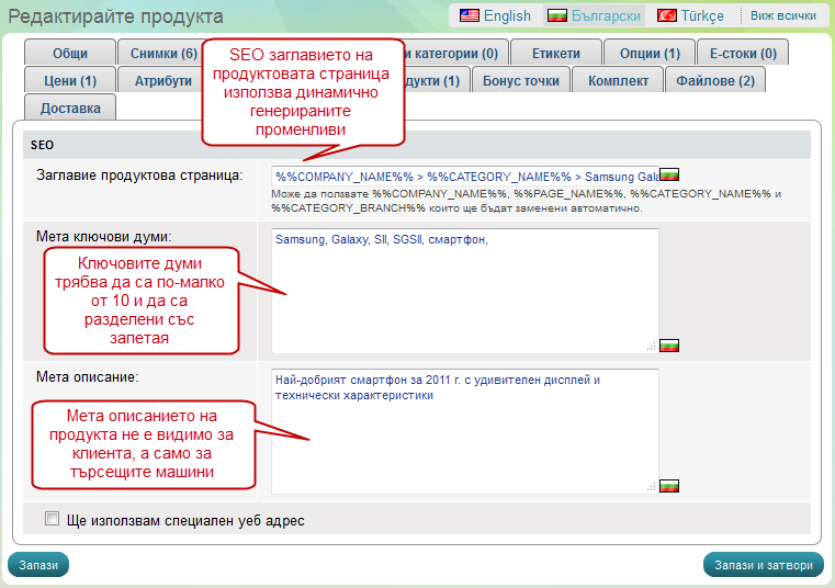 В случаят за даденият продукт има въведена информация за по-добро SEO, като се използват и променливите предоставени от Summer Cart.