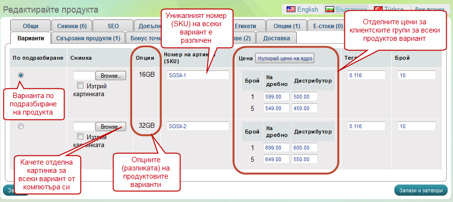 SKU код – системата генерира уникални SKU кодове за всеки вариант, но Вие може да ги промените по всяко едно време.