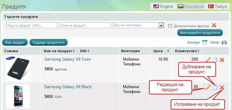 Когато изтривате продукт, Вие фактически го премахвате както от основната, така и от допълнителните категории, в които фигурира