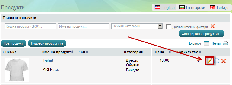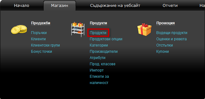 1. Отидете на меню Магазин, под 'Продукти' кликнете на връзка Продукти.