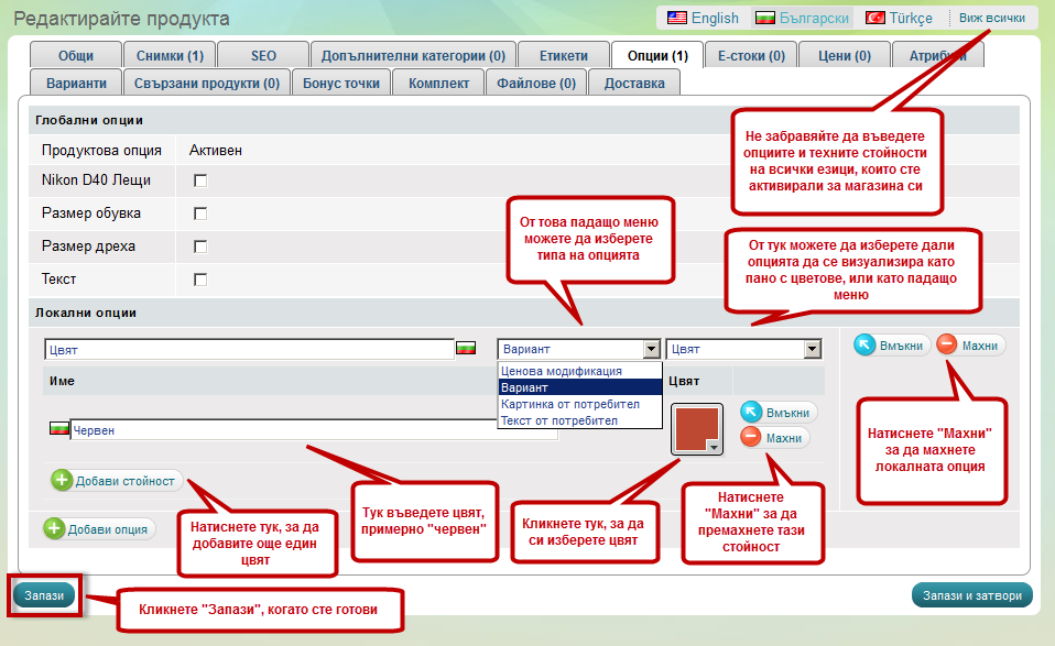 Задаваме име на опцията, примерно "Цвят", и и задаваме стойност, натискайки бутона "Добави стойност"