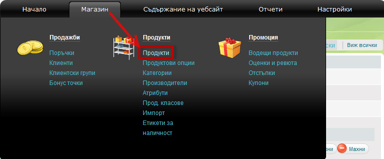 1. Отидете на меню Магазин, кликнете на връзка Продукти