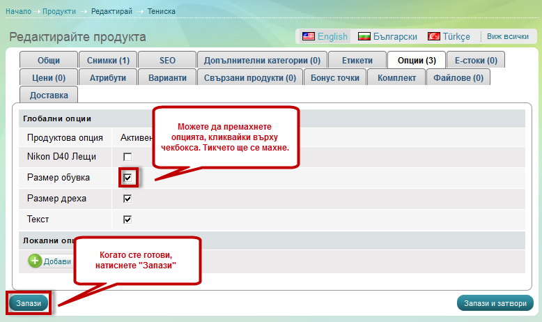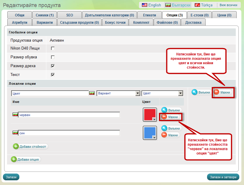 4. Ако този продукт има и локални опции, можете да ги премахнете с натискането на бутона "Махни"