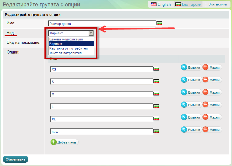 Редактиране на продуктови опции