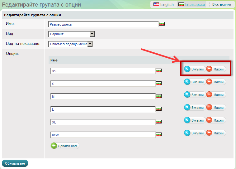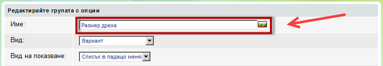 Когато редактирате продуктови опции, Вие можете да редактирате името на група опции, или да редактирате опциите вътре в групата.