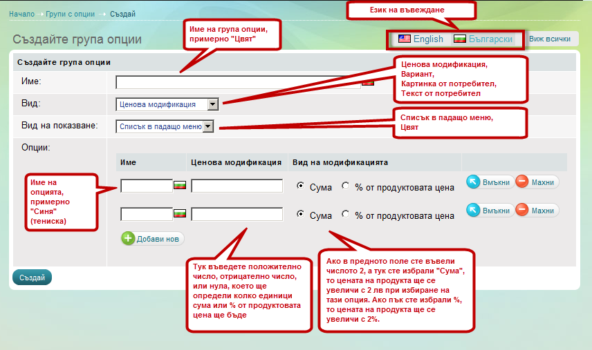 Страницата за създаване и редактиране на група опции е една и съща.