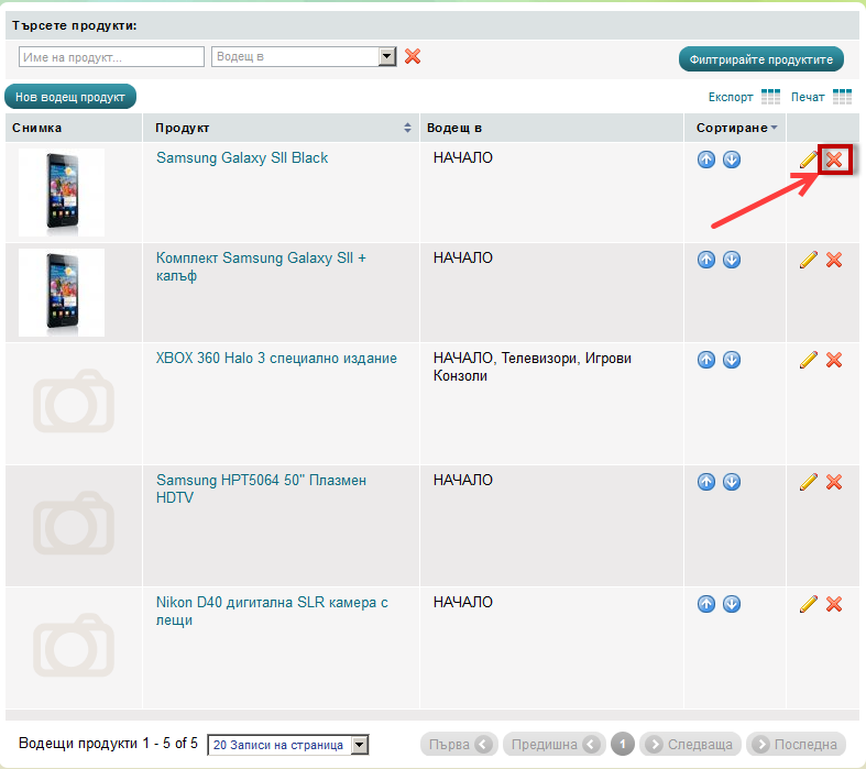 Важно:Водещият продукт се показва в началната страница на уебсайта и/или в страници с продуктови категории. Когато изтривате водещ продукт, Вие само спирате да го показвате като 'водещ', продуктът продължава да се появява в обикновените продуктови списъци.