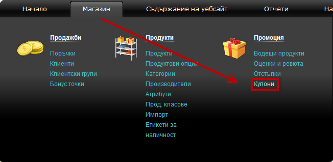 1. Отидете на меню Магазин, под 'Промоция' и кликнете на връзка Купони.