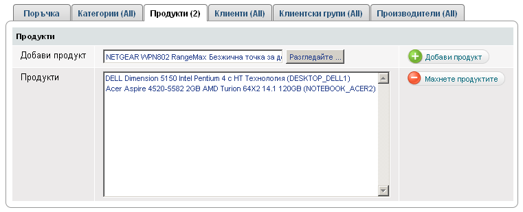 Раздел 'Продукти' в страницата 'Редактирайте отстъпка'