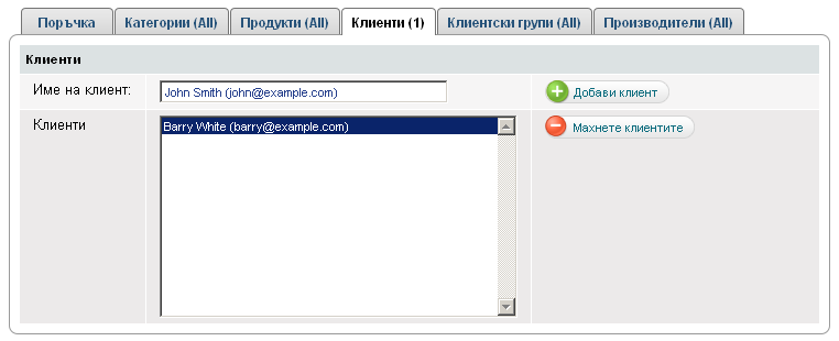 Раздел 'Клиенти' в страницата 'Редактирайте отстъпка'