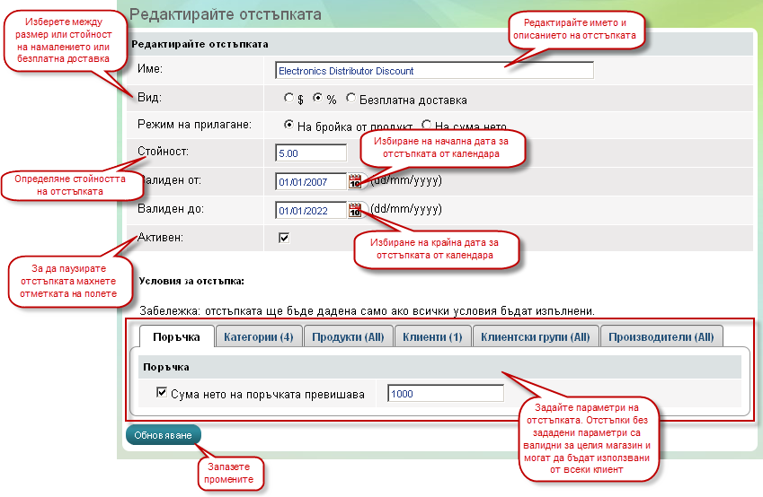 Използвайте страницата 'Редактирайте отстъпка' за редактиране на основната информация за отстъпка, или за редактирате условията за отстъпка. Вие също така може да приложите нови условия за отстъпка. Има 4 раздела, които Ви помагат да управлявате условия като минимална стойност на поръчката, избрани продуктови категории, избрани продукти и избрани клиенти.