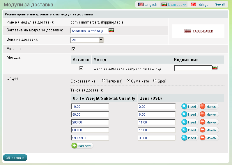 Модулът 'Базирано на таблица' Ви позволява да изчислявате доставни разходи въз основа на тегло на поръчката или нетна стойност на поръчката. За да конфигурирате модула 'Базирано на таблица', кликнете на връзка Опции в края на реда.