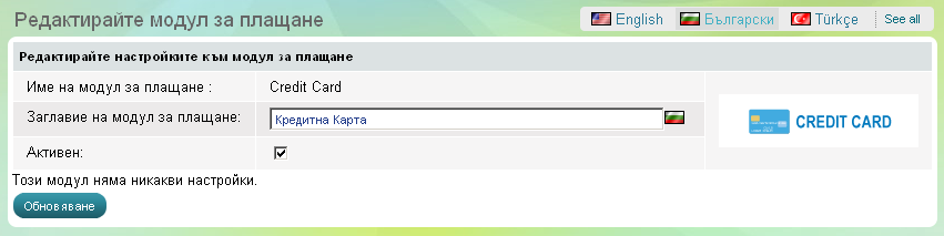 Модулът за плащане с кредитна карта може да бъде активиран или спрян с един клик по всяко време. Няма допълнителни опции за настройка.