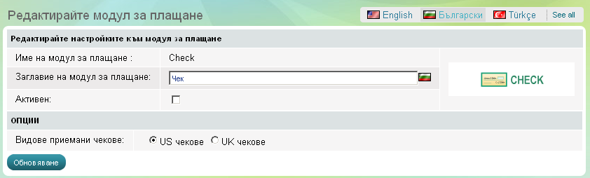Модулът за плащане с чек може да бъде активиран или спрян с един клик по всяко време. Няма допълнителни опции за настройка.