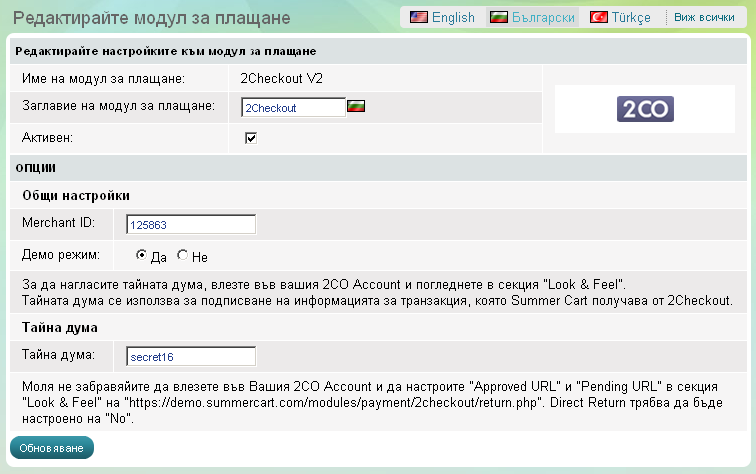 Модулът 2Checkout има 3 опции за настройка, които трябва да бъдат изпълнени преди неговото активиране: