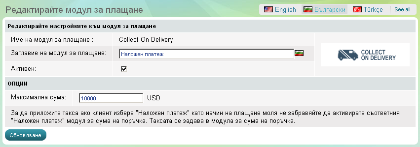 Не забравяйте, че ако искате да събирате допълнителна такса от клиенти, използващи "наложен платеж", Вие трябва да отидете в Настройки >> Модули >> Сума поръчка и да активирате съответния модул"наложен платеж". Там Вие може да посочите такса. |