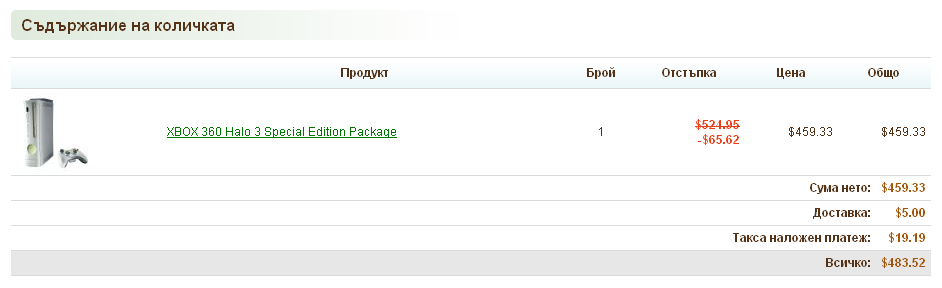 Ценоразписът на общата стойност на поръчката е видим в клиентската област преди крайната фактура и показва подробно цените на продуктите, отстъпките, данъците и доставните разходи, калкулирани в поръчката на клиента.