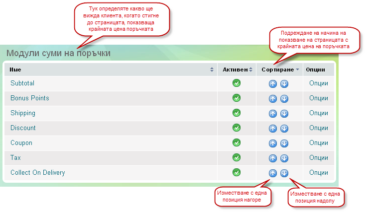 Модулът 'Subtotal' трябва винаги да е активен. Ако искате разходите за доставка да се калкулират автоматично в общата стойност на всяка поръчка, модулът 'Shipping' трябва да е активен. Ако искате отстъпките и купонните отстъпки да се калкулират автоматично в общата стойност на всяка поръчка, модулите 'Discount' и 'Coupon' трябва да са активни. Ако искате данъкът (като ДДС например) да се калкулира автоматично в общата стойност на всяка поръчка, модулът 'Данък' трябва да е активен. |