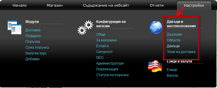 Разделът 'Местоположения и данъци' е гъвкав инструмент, който Ви помага да управлявате списъци с държави и области, да настроите данъците и да определяте зони на доставка за продуктите в магазина Ви.
