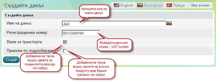 Кликнете на бутон 'Нов данък' в началото на страницата. Появява се страница 'Създайте данък'. |
