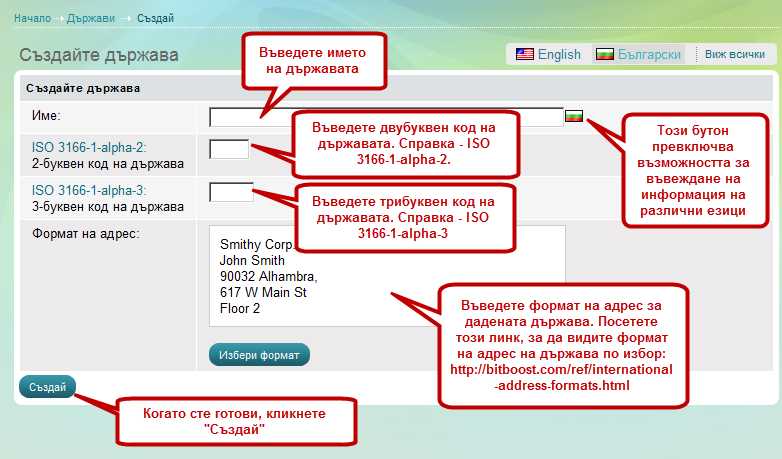 Формат на адрес - въведете формат на адрес на дадената държава. Посетете този линк, за да видите формат на адрес на държава по избор: http://bitboost.com/ref/international-address-formats.html