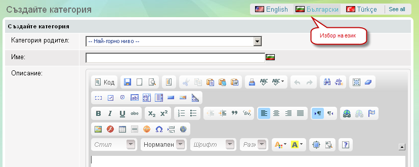 'Лентата за избор на език' е специална лента, която Ви позволява да въвеждате текст на различни езици, без да напускате страницата, която в момента използвате. Ако отворите страницата 'Създайте категория', както е показано на картинката по-долу, Вие можете да поместите многоезичен текст единствено чрез превключване на езиците.