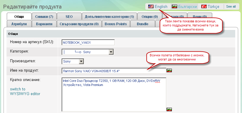 Всички полета, които могат да бъдат преведени чрез 'Лентата за избор на език', са означени с иконки знаменца. Вие можете да поставите многоезичен текст на всяка страница, където виждате 'Лента за избор на език'.