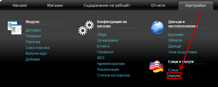 >> Отидете на меню Настройки, под 'Езици и валути' и кликнете на връзка Валути.