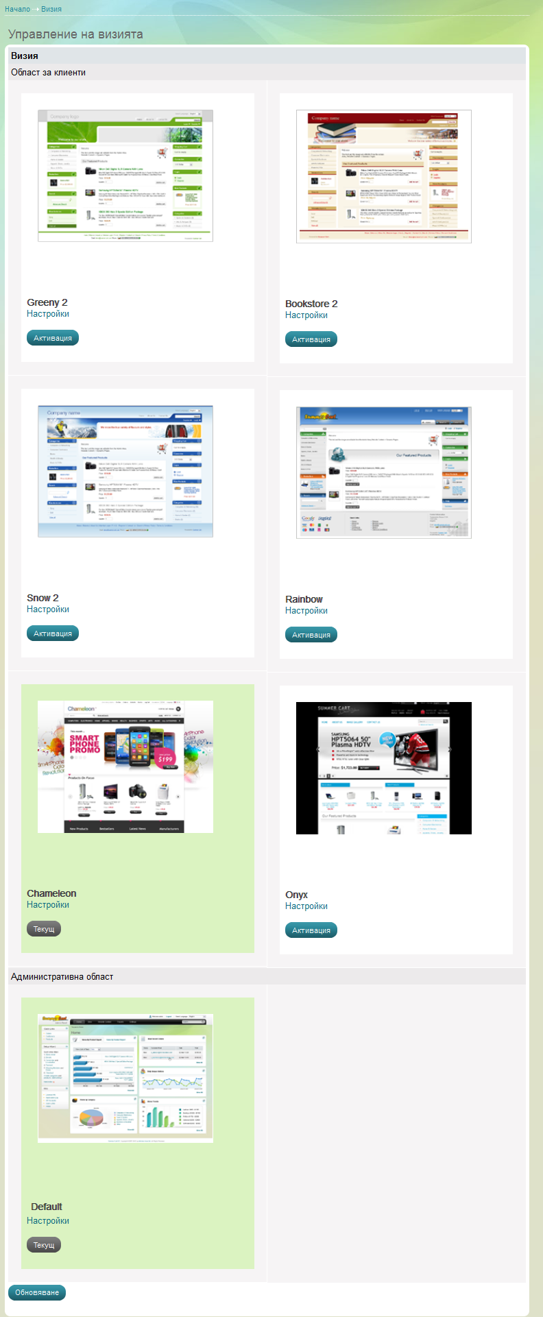 Изберете визия и натиснете "Активация" за да активирате визията. Ако изберете "Настройки" ще можете да въведете специфични настройки за визията, най-често това ще бъде качване на фирменото Ви лого.