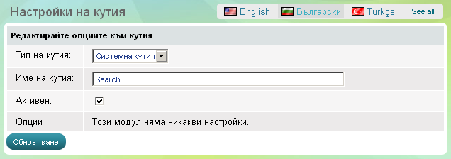 Използвайте кутията 'Търсене', за да позволите на уебсайт посетителите да търсят по ключови думи и лесно да намират продуктите и информацията, която им трябва. Кутията 'Търсене' включва връзка към страницата 'Разширено търсене'. Кутията има един параметър - да бъде активна, което означава да е видима на уебсайта, или обратното – да бъде неактивна, тогава цялата кутия изчезва.