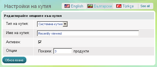 | • | да бъде активна, което означава че кутията е видима на уебсайта, или обратното – да бъде неактивна, тогава цялата кутия изчезва |