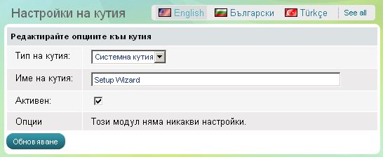 Кутията има един параметър - да бъде активна, което означава, че се вижда в административната област, или обратното – да бъде неактивна, тогава тя изчезва.