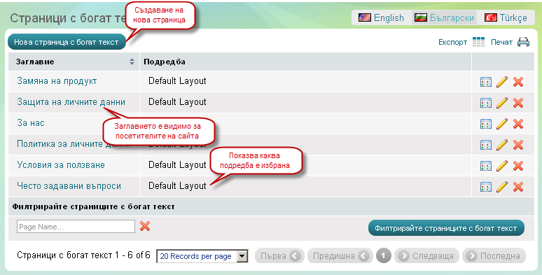 >> Отидете на меню Съдържание на уебсайт и кликнете на връзка Страници с богат текст.