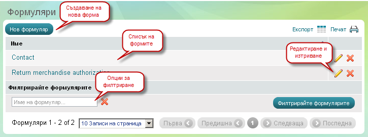 формуляри. Тук Вие можете да разглеждате, редактирате, изтривате и