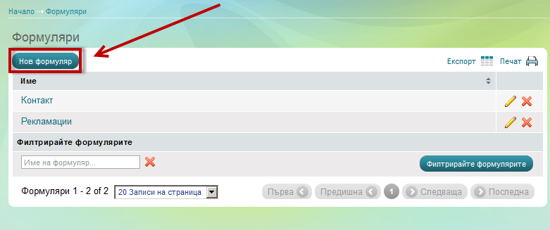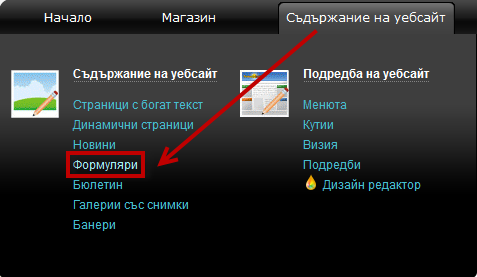| 1. | Отидете на меню Съдържание на уебсайт и кликнете на връзка Формуляри.![]() |