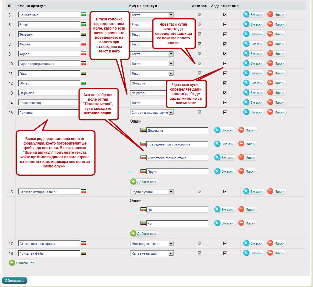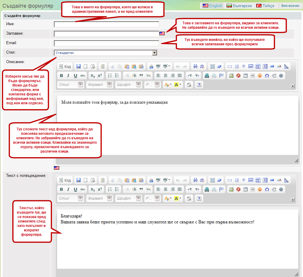Тук сложете текст над формуляра, който да пояснява неговото предназначение за клиентите. Не забравяйте да го въведете на всички активни езици. Кликвайки на знаменцето отдолу, превключвате въвеждането за различни езици.