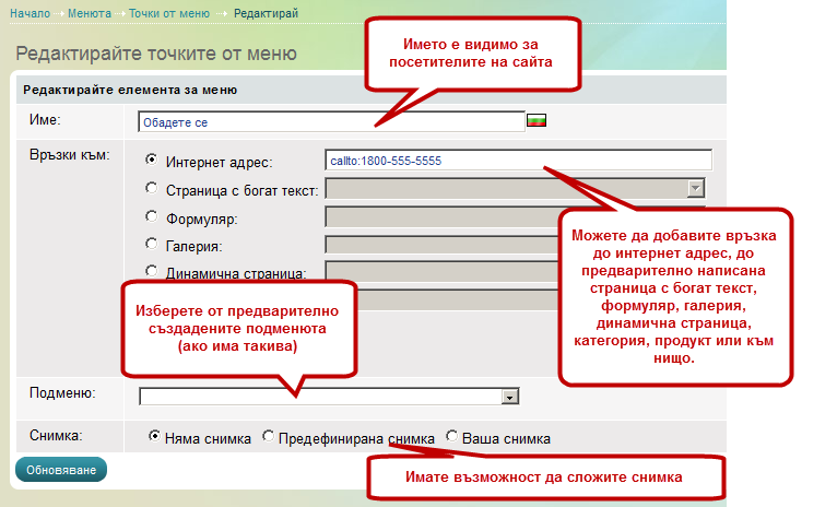 | 2. | Менюто е съставено от елементи. Елементите на едно меню могат да бъдат Интернет- адреси, страници и формуляри. Вие можете лесно да ги създавате, редактирате и изтривате. |