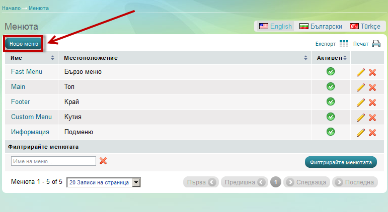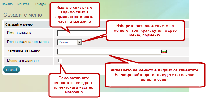 Кликнете на бутон 'Ново меню' в началото на страницата. Появява се страницата 'Създайте меню'.![]() |