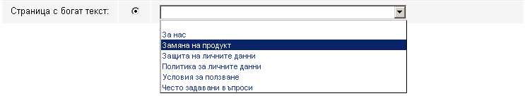 Използвайте бутона 'Нова точка от меню', за да отворите страницата 'Създайте меню елемент'. Сега кликнете върху радио бутона Страница с богат текст и изберете от падащия списък една от съществуващите страници (тук се показват всички страници с богат текст).