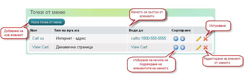 Страница 'Редактирайте меню', 'Точки от меню'